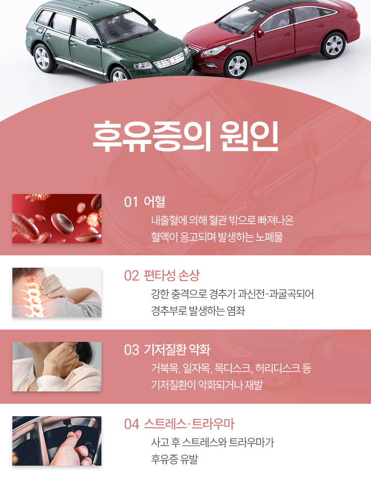 따라서 추돌 직후 느껴지는 증상이 경미한 수준에 그치고 있을지라도 광교한의원 후유증 관리는 필요합니다. 또, 관리를 위해서라면 어떤 것이 원인으로 작용하였는지 살펴 주는 과정을 밟아야 합니다. 교통사고라 하면 보편적으로 물리적인 충격에 의한 연부조직 손상을 유발할 것이라 생각합니다. 이 또한 주된 원인 중 하나지만 그에 못지 않게 신경 써야 하는 게 신체 내적 출혈입니다.