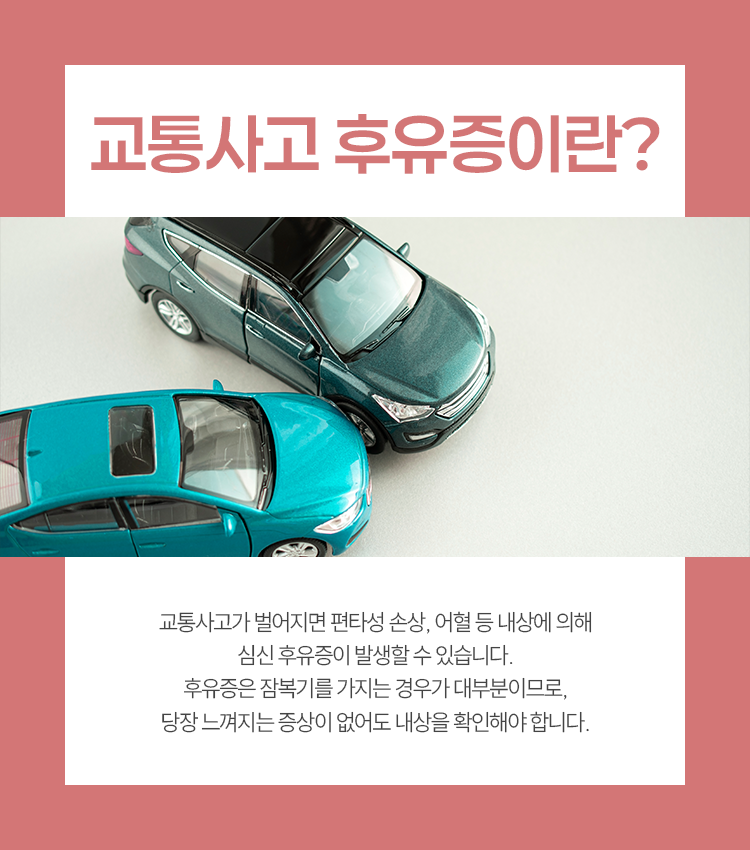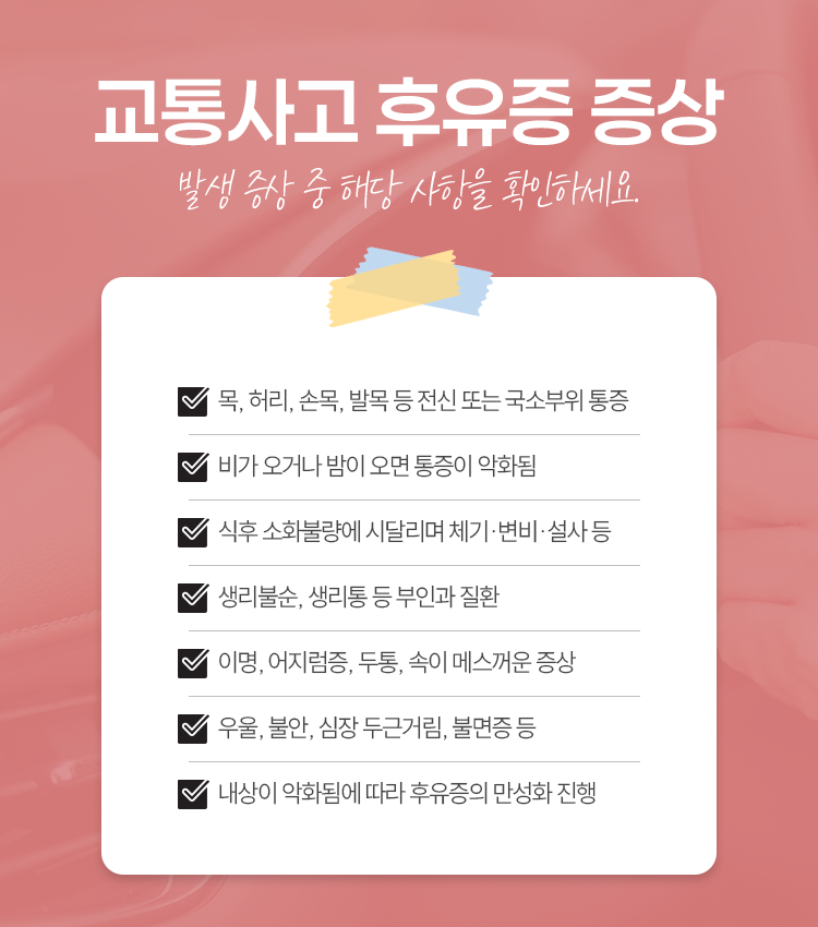 기존에 지니고 있던 목디스크나 허리디스크 같은 질환이 악화가 될 수 있고 그밖에도 크고 작은 손상이 발생하게 됩니다. 그러면서 신체적인 부분과 정서적인 부분을 가리지 않고 다양한 후유증이 동반됩니다.