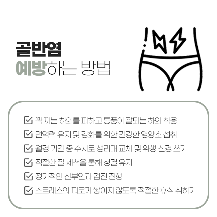 예방을 위해서는 무엇보다 평소 생활 속에서 신경쓰고 관리하는 것이 중요합니다. 꽉 끼는 하의를 피해야 하고, 통풍이 잘되는 하의를 착용해 주면 좋습니다. 또한 균형잡힌 영양소를 섭취하여 면역력을 유지하고 강화해야 합니다. 생리 중에는 수시로 생리대를 교체하여 위생에 신경스고 적절한 질 세척으로 청결을 유지해야 합니다. 그리고 정기적으로 산부인과 검진을 받는 것이 좋으며 스트레스와 피로를 잘 관리해야 합니다.