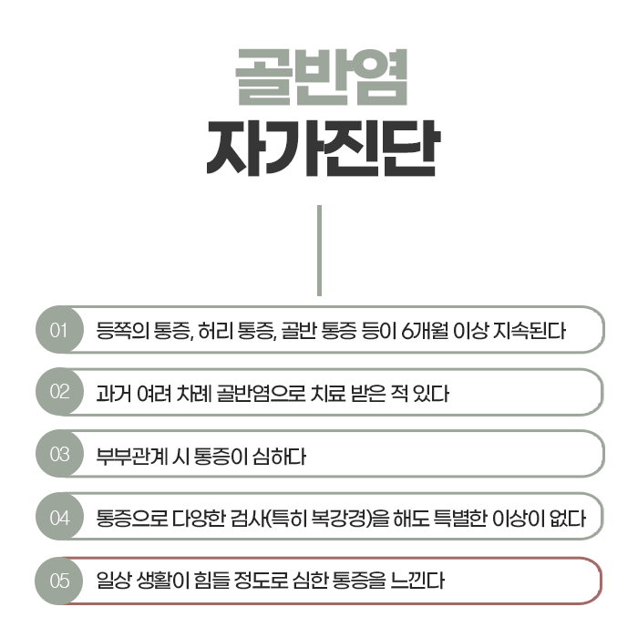 골반염의 원인은 다양한데요. 자궁 내 피임 장치, 성관계, 수술 후의 감염, 산욕기 관리 미숙 등의 세균 감염으로 발생하게 됩니다. 감염을 유발하는 원인은 세균으로, 성변의 원인인 임질균, 클라미디아균이 가장 대표적인 원인균입니다. 이 밖에도 인플루엔자균, 페렴구균, A군 연쇄구균 등이 있습니다. 만약 등쪽으로 통증이 생기거나 골반통, 요통이 6개월 이상 지속되고 과거 몇차례 골반염 치료를 받은 적이 있거나, 부부 관계시의 통증을 느끼고 검사를 했는데도 별다른 이상을 발견하지 못하였지만 일상 생활이 어려울 만큼 골반 통증이 있다면 영통구 골반통증치료 받아야 합니다.