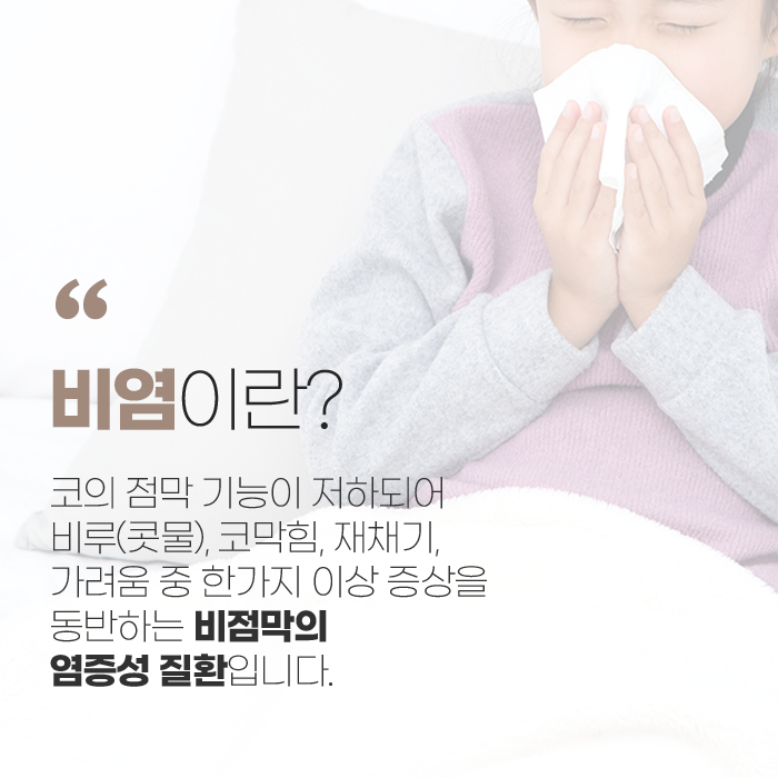 비염을 정의하자면, 코의 점막 기능이 저하되어 콧물(비루), 코막힘, 재채기, 가려움 중 한가지 이상 증상이 동반되는 비점막의 염증성 질환입니다. 코막힘이나 콧물로 숨을 쉬기 어렵고 증상이 오래 지속된다면 ‘비염’이 아닐지 의심해 보아야 합니다. 이는 날씨와 꽃가루 등 다양한 요인으로 비염이 발생하게 됩니다. 이는 코 점막을 자극하는 요인들로 인하여 알레르기나 염증에 과민성을 유발하게 됩니다.