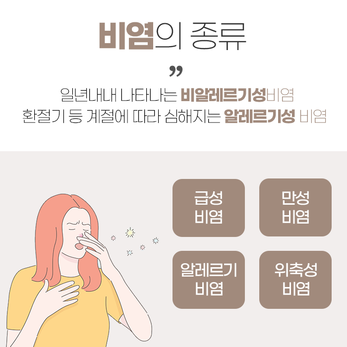 비염은 코 점막의 염증으로 유발되는 질병으로 3대 증상이라 일컫는 콧물, 코막힘, 재채기가 동반됩니다. 그리고 코 가려움증이 동반되기도 합니다. 비염은 원인에 따라서 알레르기성 비염, 혈관 운동성 비염, 만성 비염으로 구분지을 수 있고 저마다 다른 원인과 증상을 동반합니다.