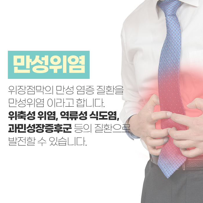 이러한 증상이 지속된다면 위축성 위염, 역류성 식도염, 과민성 대장증후군 등 다양한 질환으로 확장될 수 있으므로 원천동 속쓰림치료 바르게 진행되어야 합니다. 급성 위염과는 다르게 염증을 유발하는 원인이 지속 작용하여 위장 장애 증상이 나타나게 되는 만성 위염! 치료가 늦어지면 심각한 질환으로 이어질 수 있으므로 주의가 필요한 질환입니다.