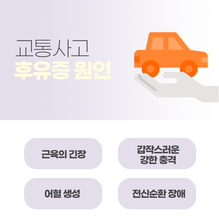 안전벨트를 메고 있더라도 사고 발생시의 큰 충격으로 인하여 신체에 영향을 줄 수 밖에 없습니다. 몸이 앞뒤로 심하게 흔들리거나 강하게 부딪히게 됩니다. 강한 충돌로 인하여 신체 이곳 저곳에 손상이 발생할 수 있습니다. 증상은 환자마다, 사고의 경위나 규모에 따라서 다르게 나타납니다. 후유증은 신체적인 증상 뿐만 아니라 정신적인 증상으로도 발병할 수 있습니다. 따라서 유형에 맞추어 몸과 마음을 고루 살피고 악화를 막도록 신경을 써야 합니다.