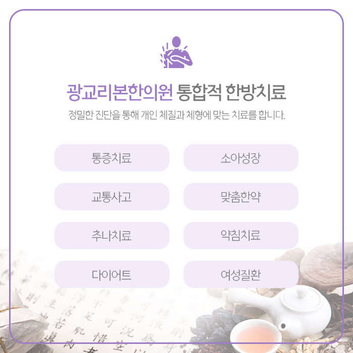 체질에 맞는 약재를 활용해 조제하는 한약은 어깨주변 어혈을 제거하고 기혈순환을 촉진해 통증을 줄이고, 손상된 조직의 재생을 돕습니다. 그리고 건강한 혈액을 생성해 면역력 향상과 전반적인 건강증진을 기대할 수 있습니다. 광교한의원에서 처방드리는 한약은 어깨통증 원인과 동반되는 문제, 건강상태에 따라 복용횟수와 기간이 달라질 수 있습니다.