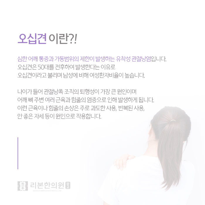 어깨 통증은 누구나 한 번쯤 경험하는 증상이고, 그 원인은 개인차가 있으며 매우 다양합니다. 중장년층에게 많이 발생하는 어깨 통증은 오십견이 원인일 가능성이 높습니다. 오십견은 어깨 관절을 둘러싼 관절낭에 염증이 생기면서 발생하는 어깨질환입니다.