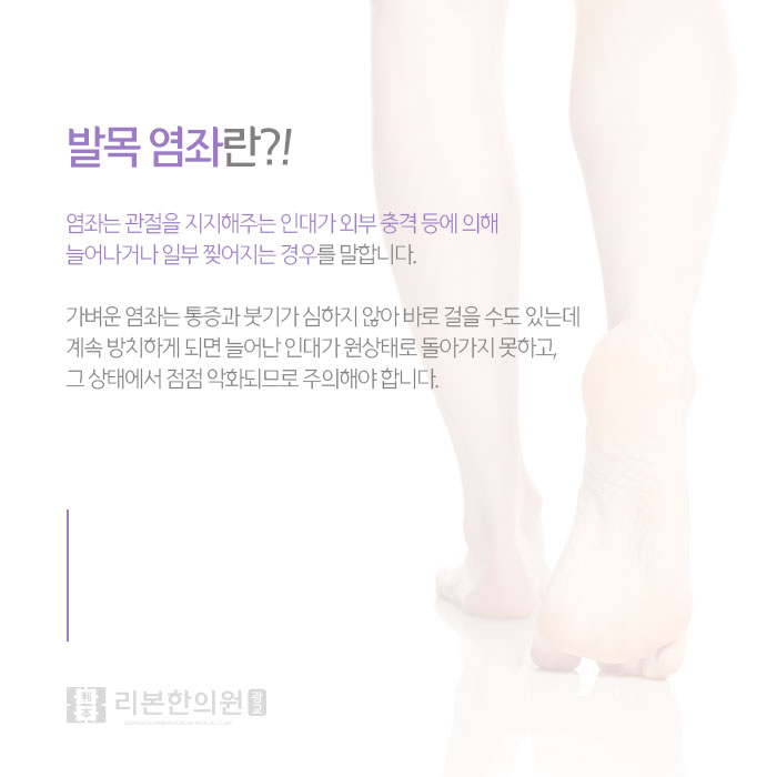 관절을 지지해 주는 인대, 근육이 외부 충격 등에 의해 늘어나거나 일부 찢어지는 것을 염좌라고 합니다. 염좌가 가장 흔하게 발생하는 부위는 발목입니다. 관절인대는 안쪽에 있는 강한 내측 인대와 상대적으로 약한 외측 인대에 의해 유지됩니다.