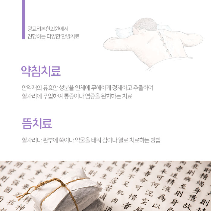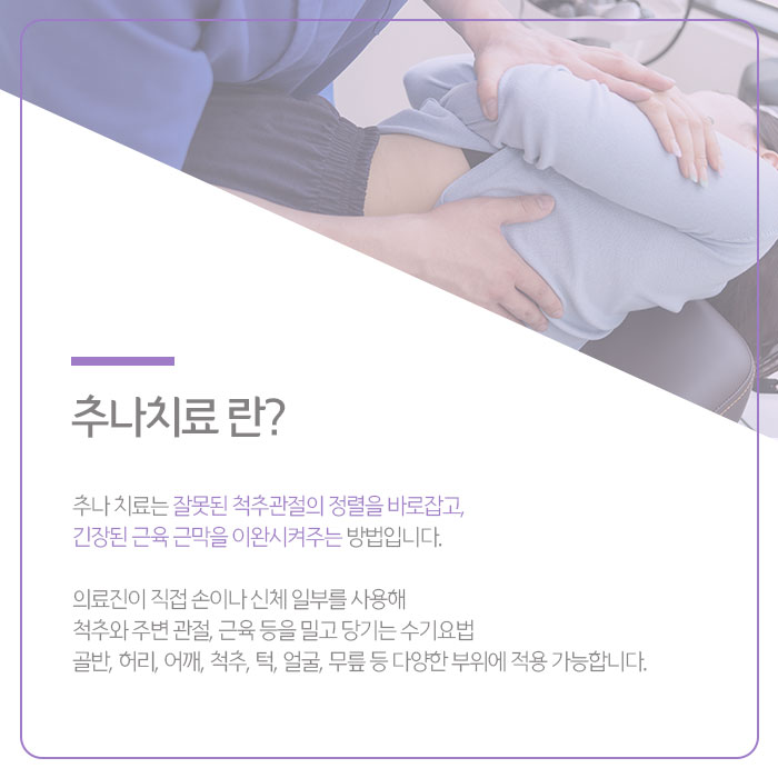 신체불균형으로 발생하는 통증 및 여러 문제를 개선하기 위해 추나요법, 한약, 약침, 부항, 뜸 등의 복합적인 한방치료를 진행합니다. 추나요법은 의료진이 손이나 신체, 소도구 등을 활용해 환자분 신체를 밀고 당기는 자극으로 정렬을 바로잡고 특정부위의 부담을 줄이는 한방치료입니다.