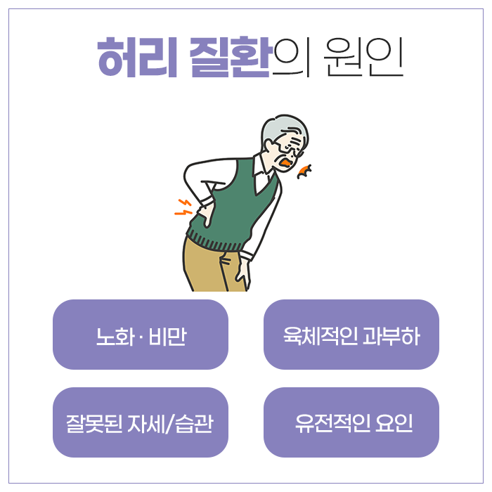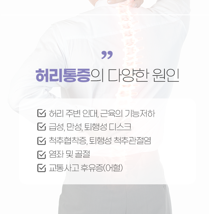 허리 주변의 근육과 인대의 기능이 저하되고 급성, 만성, 퇴행성으로 진행되는 척추 디스크, 퇴행성 척추 관절염, 척추 협착증, 강직성 척수염, 골절 및 염좌, 교통사고나 낙상으로 유발된 외상 후유증 등등 다양합니다.