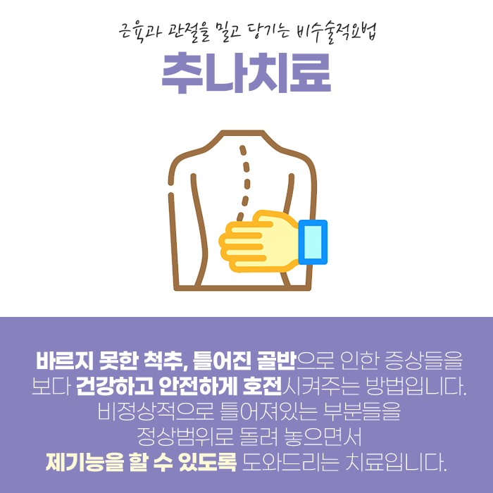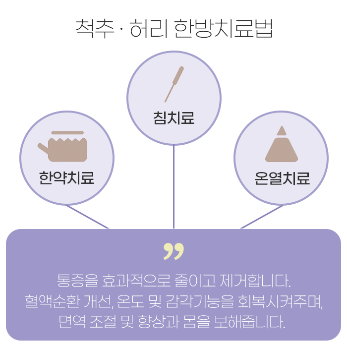 효과적인 통증 제거를 위한 광교 척추치료한의원 한방치료! 침 치료, 물리치료, 온열 치료, 한약 치료, 추나 치료 등을 통하여 증상을 개선합니다. 혈액 순환을 개선해주어 온도, 감각의 기능을 되찾아 주고 면역력을 높이고 향상시켜 부족한 부분을 보충하여 줍니다. 관절과 근육을 밀고 당기는 비수술적 요법인 추나치료는 바르지 못하고 비틀어진 척추와 골반으로부터 유발된 여러 가지 증상을 안정적으로 호전시켜 줍니다. 비정상적인 부분을 정상 범위로 회복하고 제기능을 되찾아 줍니다. 이는 치료 과정 혹은 치료 후에도 부담이 적어 일상 속에서 무리없이 치료가 가능합니다.