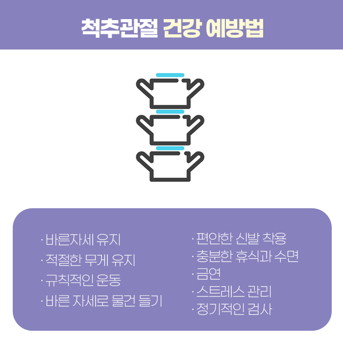 척추 건강을 지키려면 치료도 중요하지만, 무엇보다 생활 습관을 개선하는 것이 중요합니다. 평소 바른 자세를 유지하여 생활하고, 규칙적으로 운동을 꾸준히 해주어서 허리 근육을 튼튼하게 강화해야 합니다. 또한 편한 신발을 착용해야 하고 충분하게 휴식해 주어야 합니다. 너무 무거운 물건을 들어 올릴 때 바른 자세로 들어올려야 하고, 흡연은 혈액 순환을 방해하므로 허리 신경 및 연부의 조직에 악영향을 줄 수 있어 금연하는 것이 좋습니다. 게다가 스트레스를 잘 관리해야 하고 정기적인 검사로 꾸준히 신경써서 관리하도록 해야합니다.
