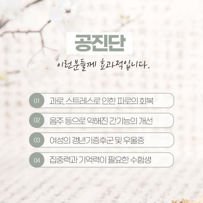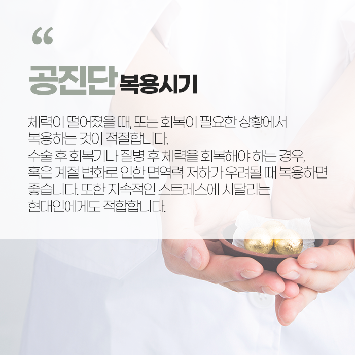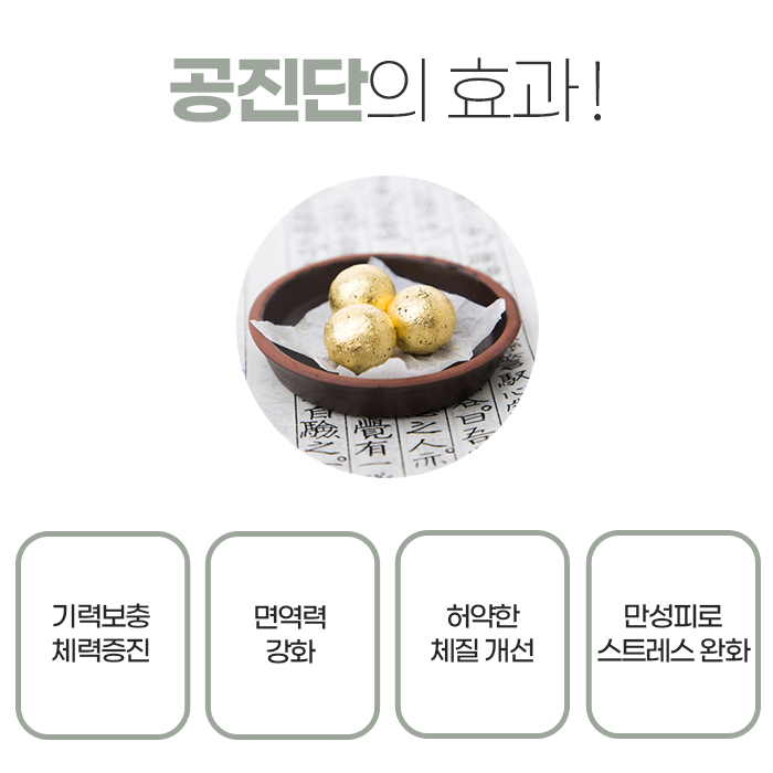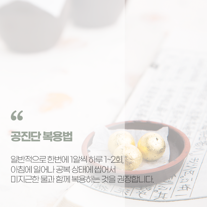 정신적인 스트레스로 만성피로에 시달리거나 선천적으로 체질에 허약한 분들에게도 영통 공진단 효과를 줄 수 있습니다. 신경이 예민하고 운동량이 부족한 여성에게도 도움이 됩니다. 한방에서는 공진단을 기력저하, 피로, 집중력 저하, 식욕부진, 피부혈색 불량, 두통, 구내염, 산후 수족냉증 등을 다스리도록 처방하여 줍니다. 보통 하루에 1환을 복용하거나 1/2환을 2회로 나누어 복용하도록 합니다. 식전이나 식후에도 무관하게 복용이 가능합니다.