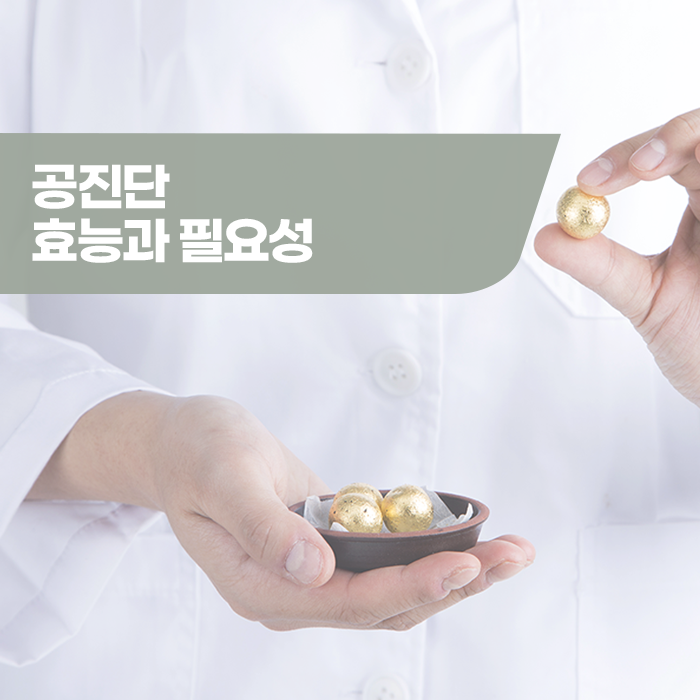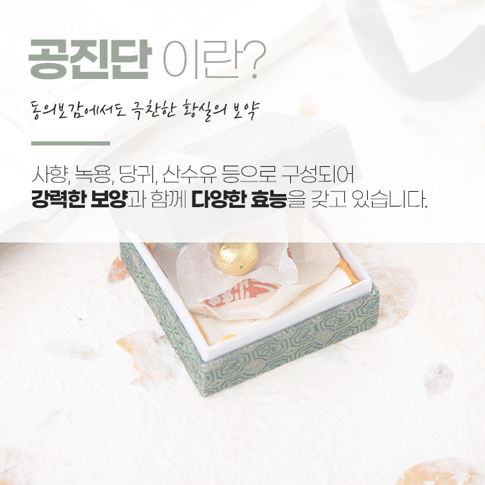 동의보감에서는 영통구 공진단 이렇게 표현하고 있습니다. 얼굴에 핏기가 없고 어지러움을 느끼고, 다리가 저리고 시리며 잘 보이지 않는데 사용한다고 합니다. 만성 서모성 질환, 빈혈 등에도 효과를 줍니다. 머리를 많이 사용하여 열이 오르고 두통이 올 때도 효과적인데요. 한의학에서는 공진단을 찬 기운은 위로 올라오고, 열은 아래로 내려주는 수승화강을 해주는 목적으로 사용하고 있습니다. 공진단의 원료는 사향, 녹용, 당귀, 산수유 4가지가 대표적입니다.