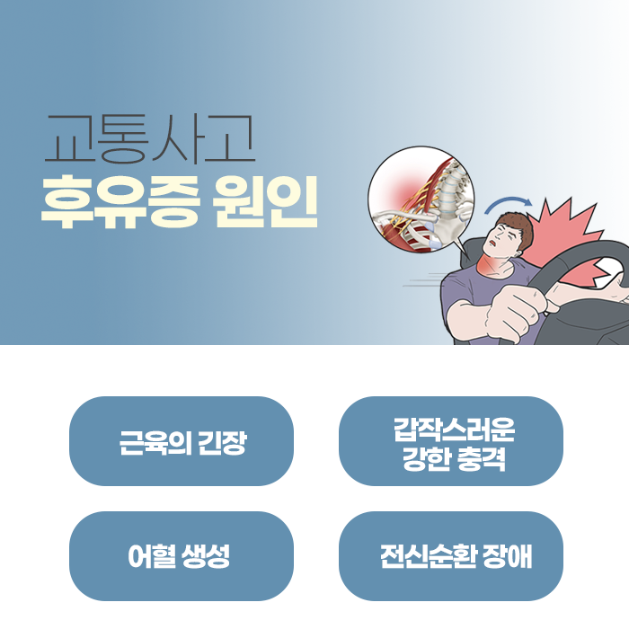 여러 가지 후유증을 유발하는 교통사고! 특히 경추부 염좌는 편타성 손상으로 유발되는 증상입니다. 얼굴, 턱, 목, 허리, 골반, 어깨, 무릎, 손목, 발목 등이 손상되면서 연부 조직이 손상되고 여러 가지 증상들이 유발됩니다. 요즘 사람들은 활동량이 부족하고 바르지 못한 자세나 습관에 장시간 노출되어 있는 만큼 근골격계가 약하고 기능이 저하되어 있기 때문에 사고가 발생하면 더욱 큰 손상을 입곤합니다.