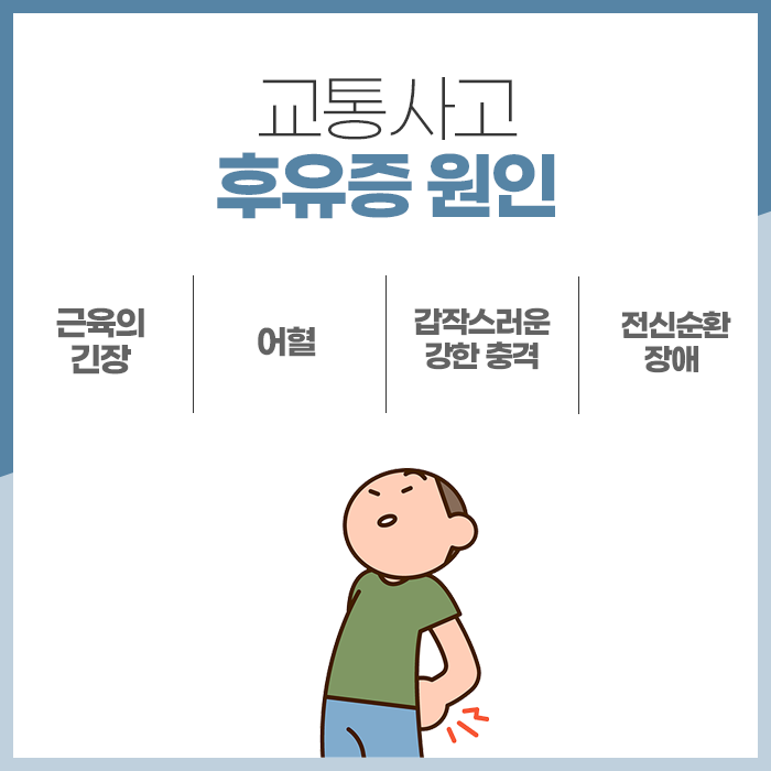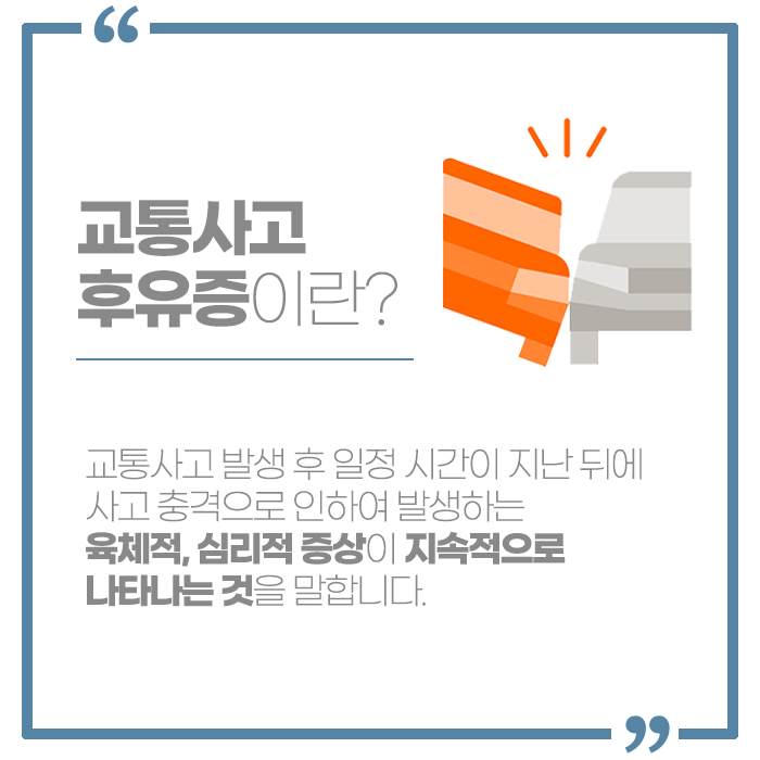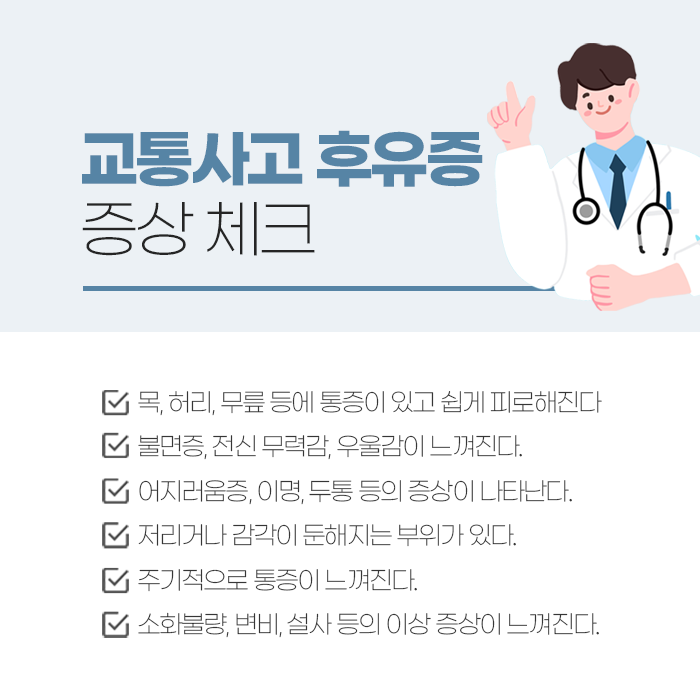 교통사고는 나만 주의한다고 피할 수 없는 문제입니다. 언제 어떻게 발생할지 모르기 때문에 사고에 대한 처리와 대처를 잘 파악해두고 항상 주의하도록 해야합니다. 특히 건강 상태를 잘 염두하고 신경써서 관리해야 합니다. 경미한 정도의 사고라면 대부분의 사람들이 차량의 파손에만 신경을 쓰고, 바쁜 업무로 인하여 건강 상태를 살피는 것을 미루는 경우가 많습니다. 하지만 교통사고 발생 시 후유증을 유의해야 하고, 건강 상태를 잘 살펴야 합니다.
