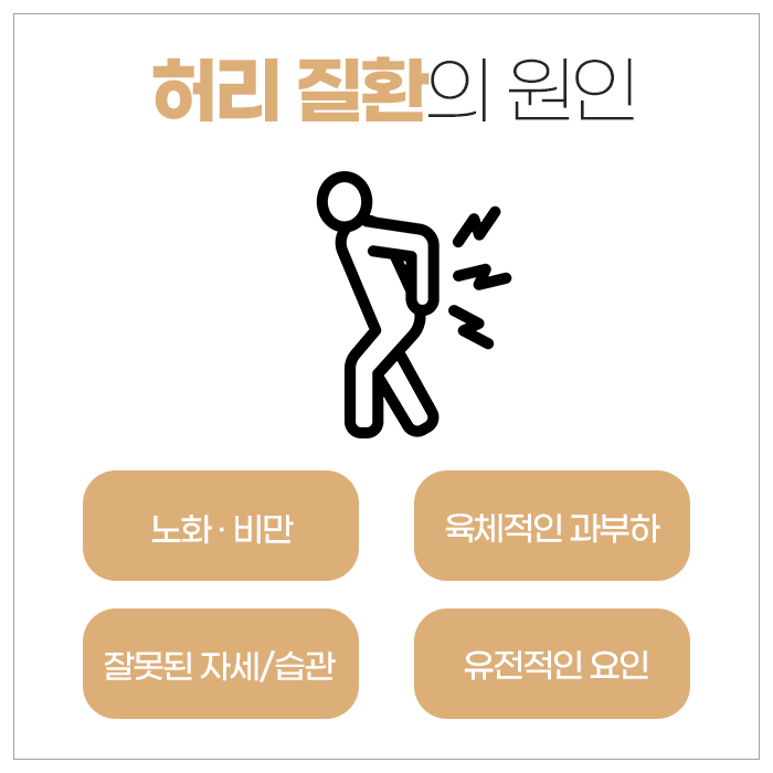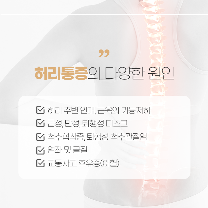 허리는 신체의 중심으로 일상 속에서 많은 무리를 받게됩니다. 그만큼 통증을 호소하게 되거나 관련된 질환을 호소하게 됩니다. 허리 통증은 통증 자체만으로도 하나의 증상으로 여기지만, 여러 가지 질환을 원인으로 발생할 수 있습니다. 허리 통증을 유발하는 원인은 다양합니다. 척추와 관련된 구조물인 척추뼈, 근육, 인대, 디스크, 후관절 등 병적인 변화로 허리 통증이 느껴질 수 있습니다.