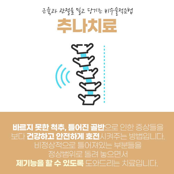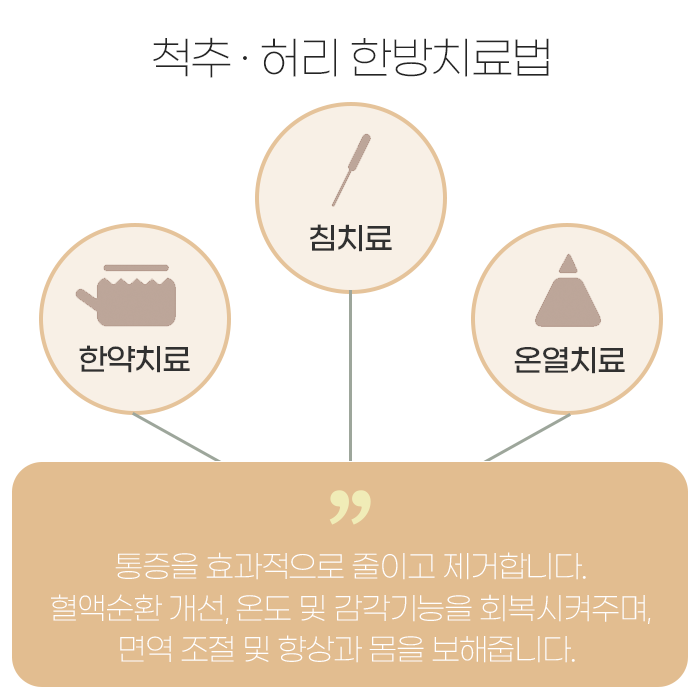 허리의 통증 원인을 파악하여 해소하고 바르게 교정해 주어야 합니다. 진단이 같더라도 통증의 원인이 다를 수 있습니다. 같은 디스크 탈출증이어도 디스크가 신경을 직접 압박하여 통증을 호소한다면 수술이 필요할 수 있고, 신경을 자극하는 염증 때문에 통증이 나타날 경우 염증을 개선하도록 치료해야 됩니다.
