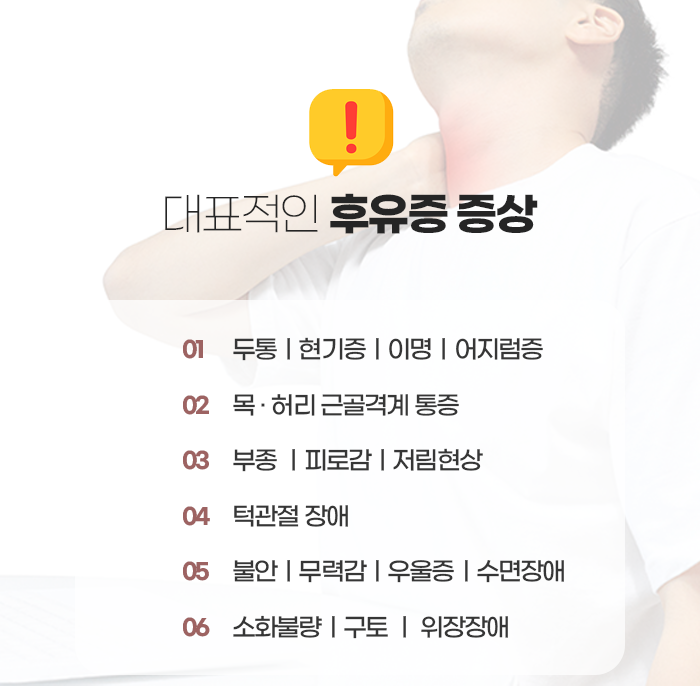 이 외에도 다양한 증상들이 함께 나타나기도 합니다. 식욕 저하, 식후 소화 불량, 일어설 때 갑자기 빙글빙글 돌고 어지러운 증상, 머리가 무겁고 지끈거리는 등의 증상들이 유발될 수 있습니다. 또한 심장 두근거림, 초조함, 불안함, 우울감 등 심리적인 증세들이 동반되기도 합니다. 잠이 잘 오지 않거나 숙면을 취하기 힘들어 지기도 합니다. 그만큼 컨디션이 저하될 수 있기에 불편함이 유발되면 내상을 잘 살펴보아야 합니다.