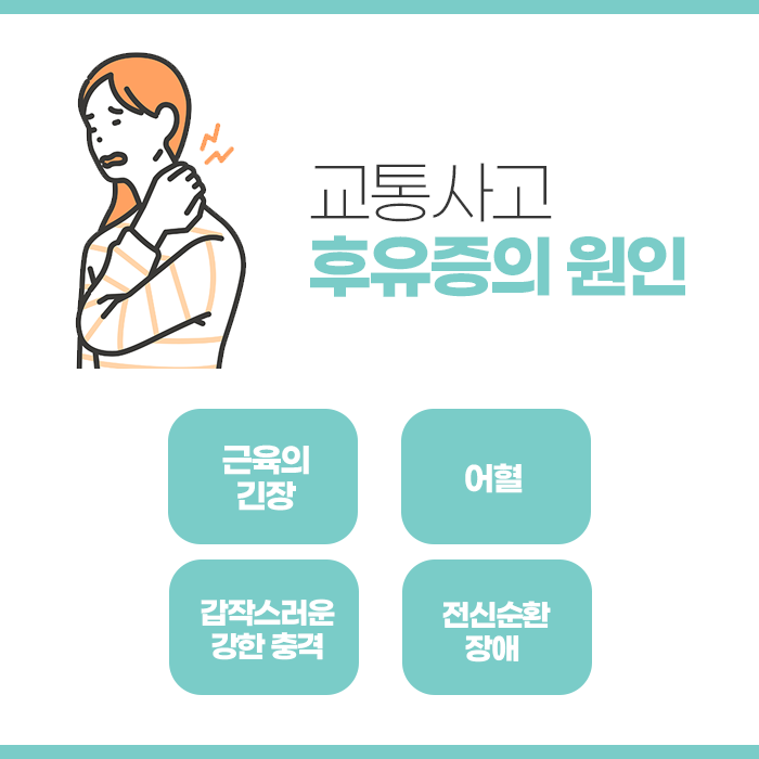 사고로 인한 대표적인 증상 중 하나는 경추부 염좌(편타성 손상)입니다. 이 증상은 목 주변이 급격하게 꺾이거나 흔들리면서 근육, 인대, 신경 등의 연부 조직들이 손상을 입게되고, 그로 인해 전신의 다양한 부위에서 통증이 발생할 수 있습니다.