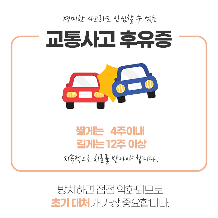 교통사고는 예기치 않게 누구에게나 찾아올 수 있는 일이므로, 겉보기엔 괜찮아 보여도 자신의 몸 상태를 세심하게 살피는 태도가 필요합니다. 특히 사고 후 첫 4주 동안의 집중적인 치료가 회복에 매우 중요한 시기입니다. 통증이나 불편함이 있다면 지체하지 말고 전문 의료기관에서 정확한 진단과 적절한 치료를 받는 것이 회복의 첫걸음이 될 수 있습니다.