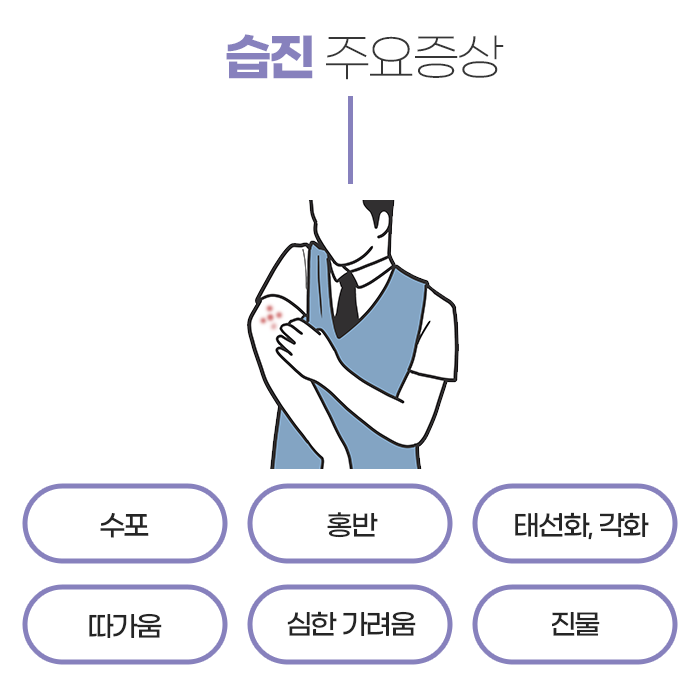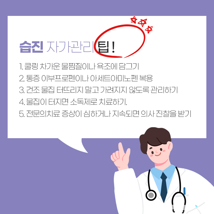 또한 습진은 전염성이 있는 질환이기 때문에, 타인과의 피부 접촉이나 물건 공유를 피하고, 사람이 밀집된 장소 방문은 자제하는 것이 좋습니다. 일상에서는 병변 부위를 시원하게 유지하며 자극을 최소화하고, 생활 전반에서 피부 보호를 위한 습관을 들이는 것이 중요합니다.