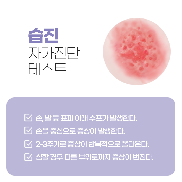 증상은 초기에는 작고 투명한 물집이 손가락 사이, 손바닥, 발바닥 등에 생기며, 점차 병변이 커지고 가려움증과 따가움, 열감 등이 동반됩니다. 특히 비누, 물 등 자극 물질이 닿으면 증상이 더 심해질 수 있습니다. 심한 경우 홍반, 태선화(피부가 두꺼워지고 거칠어짐), 진물 등의 증상으로까지 악화될 수 있습니다. 물집은 보통 2~3주 간격으로 반복되어 나타나며, 자극을 받을 경우 다른 부위로 번질 수 있습니다.