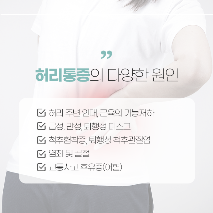 허리 통증의 원인은 매우 다양합니다. 단순한 근육통, 인대 손상부터 시작해서 디스크 질환(추간판탈출증), 퇴행성 척추질환, 척추관 협착증, 척추염, 골절 및 염좌, 외상 후유증에 이르기까지 원인이 복합적일 수 있습니다. 잘못된 자세나 반복되는 무리한 동작, 비만, 노화, 운동 부족 등도 요통의 원인이 되며, 때로는 유전적 요인도 영향을 미칩니다.