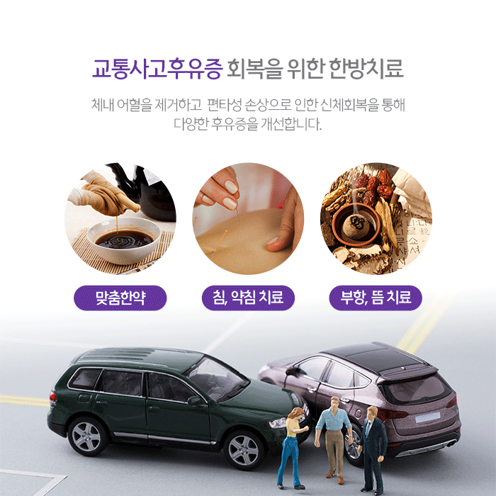한약은 사고 후유증과 개인 건강상태에 따라 복용횟수와 기간은 달라질 수 있습니다. 침은 경혈을 자극해 혈류순환을 촉진하며 신체 회복을 돕습니다. 그리고 생약 및 한약성분에서 추출해 정제한 약물을 소량 주입하는 약침치료는 과한 긴장을 풀어주고 어혈을 제거해 통증과 염증을 완화합니다.