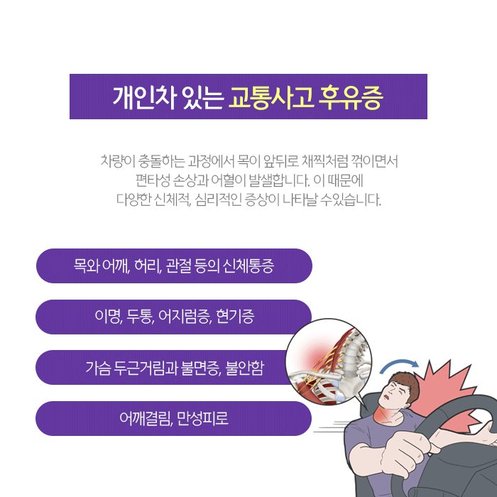 또한 목은 뇌에서 나오는 척수신경이 지나가는 통로이므로 목을 다치면 사지의 저림이나 심한 경우 사지마비까지 나타날 수 있습니다. 이와 함께 나타나는 교통사고후유증은 목, 허리, 어깨 등의 신체통증 외에도 두통과 이명, 팔다리 저림, 소화불량, 불면증, 두근거림 등이 있습니다. 증상과 발현시기에 개인차가 있는 만큼 검사를 통해 확인해보는 것이 바람직합니다.
