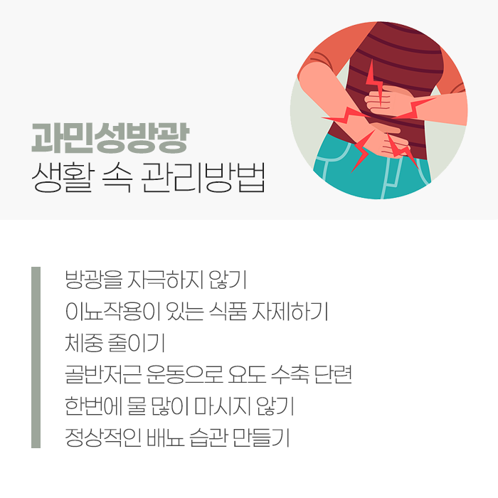 증상이 심하지 않다면 생활습관 교정만으로도 충분히 좋아질 수 있습니다. 방광을 자극하는 커피, 녹차, 에너지음료 등 카페인 음료와 술은 줄이고, 물은 하루 1.5~2리터 정도 적당히 마셔 방광이 자극되지 않도록 관리하는 것이 중요합니다. 다만 물을 너무 적게 마시면 소변이 농축되어 방광을 더 자극할 수 있으므로, 적절한 수분섭취가 필요합니다.
