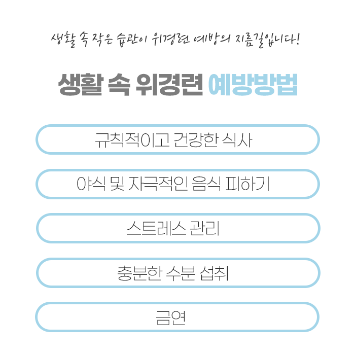그리고 충분한 수분 섭취는 위장 점막을 보호하고 소화를 원활하게 돕습니다. 하지만 너무 찬 음료는 피하고 미지근한 물이나 허브차를 권장합니다. 또한 스트레스를 완화할 수 있는 방법을 생활화하여 자율신경계를 안정화 시키고 위장에 자극을 줄 수 있는 약물 복용 시 의사와 상의하며 위 보호제를 병행하는 것이 좋습니다. 또한 충분한 수면, 규칙적인 운동, 금연, 절주 등을 실천하여 전반적인 건강 상태를 개선하면 위경련 예방에 도움이 됩니다.