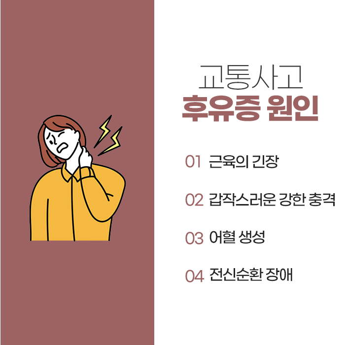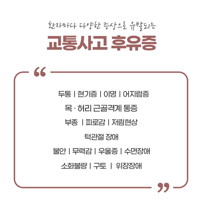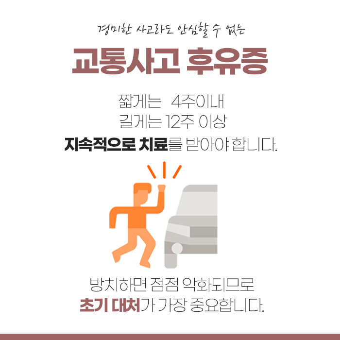 교통사고는 그 자체로 큰 충격을 주는 사건이지만, 사고 후 신체에 미치는 영향은 단순한 외상으로 그치지 않을 수 있습니다. 많은 사람들이 사고 후 “큰 부상이 없다”는 이유로 병원 방문을 미루거나 치료를 받지 않는 경우가 많지만, 이는 오히려 후유증을 초래할 수 있기 때문에 각별한 주의가 필요합니다.