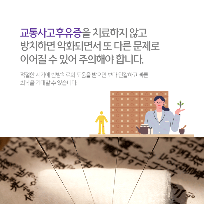 적절한 시기의 한방치료와 함께 개인적인 건강관리가 병행된다면 보다 원활한 회복을 기대할 수 있습니다. 사고 이후 발생하는 모든 증상을 말하는 사고 후유증은 발현시기와 증상에 개인차가 있어 검사를 통해 확인해보는 것이 바람직합니다.