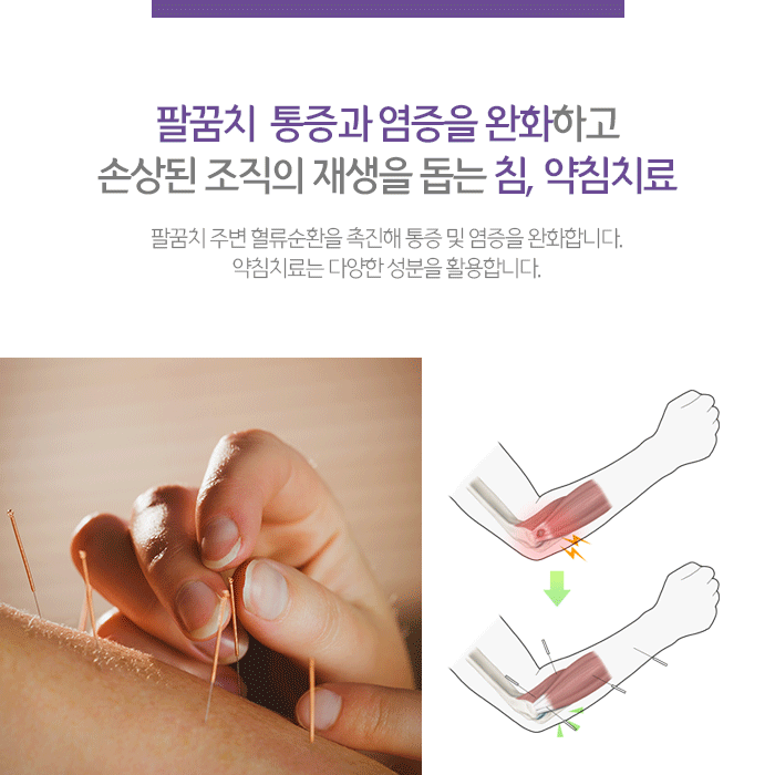 주입되는 약물에 따라 봉침 등 여러 방법이 있으며 성분에 대한 알레르기 반응과 체질을 고려해 적용하는 한방치료입니다. 쑥을 활용한 뜸 치료와 온열치료는 팔꿈치 주변에 따듯한 기운을 전달해 불필요한 긴장과 통증을 줄이고 어혈을 제거해 회복에 도움이 됩니다. 외에도 다양한 한방치료는 팔꿈치 통증 원인과 증상에 따라 다르게 적용되므로 담당 의료진과 상담을 통해 확인할 수 있습니다.