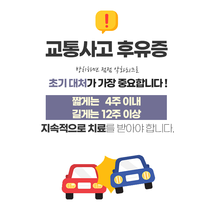 무엇보다도 교통사고 후 증상을 가볍게 여기지 않고, 조기에 전문적인 진단과 치료를 받는 것이 회복 속도를 높이고 후유증을 최소화하는 핵심입니다. 치료 시기를 놓치면 손상된 조직이 제대로 회복되지 못해 만성 통증으로 이어질 수 있으며, 이로 인해 수개월, 수년 동안 지속적인 불편을 겪는 사례도 적지 않습니다.