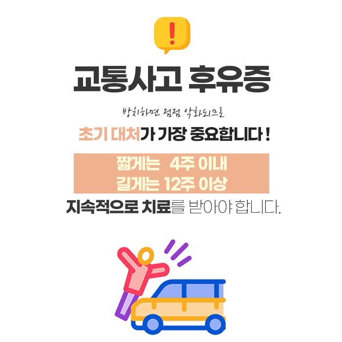 무엇보다 중요한 것은 치료 시기를 놓치지 않는 것입니다. 사고 직후 적절한 검사와 치료를 통해 손상을 빠르게 진단하고 회복을 위한 조치를 취해야, 장기적인 후유증 없이 건강한 상태로 회복할 수 있습니다. 반면, 통증을 참고 지내거나 치료를 미루는 경우 손상 부위가 만성화되어 치료가 더 오래 걸리고, 일상생활에 불편함이 지속될 수 있습니다.