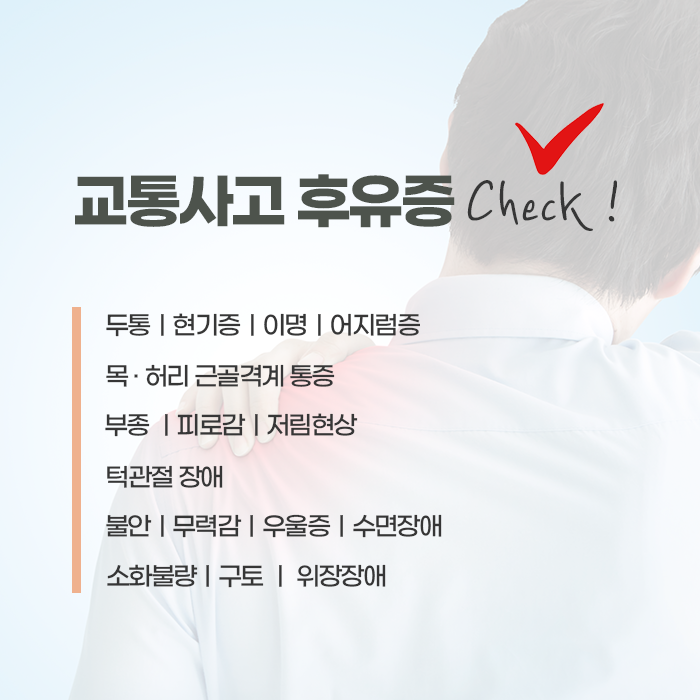 교통사고 후 신체에 나타나는 다양한 증상은 단순한 피로나 근육통으로 넘길 수 없는 중요한 신호일 수 있습니다. 치료 시기를 놓치지 않고, 체계적이고 지속적인 관리를 통해 건강을 회복하는 것이 사고 후유증을 줄이는 가장 확실한 방법이라 영통교통사고한의원 에서는 말합니다.
