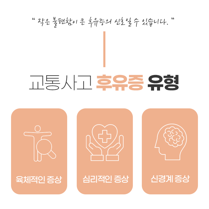 또한, 사고 후에 나타나는 증상은 단기간에 사라지지 않는 경우가 많습니다. 오히려 며칠 또는 몇 주가 지난 뒤에 통증이 심화되거나 새로운 증상이 발생하기도 하며, 때로는 신체 전반에 영향을 주는 경우도 있습니다. 이렇듯 교통사고로 인한 손상은 단순히 물리적인 문제에 그치지 않고 신경계, 근골격계, 심리적 측면까지 영향을 미칠 수 있으므로, 단순히 ‘시간이 지나면 낫겠지’라는 안일하게 여기지 않아야 합니다.