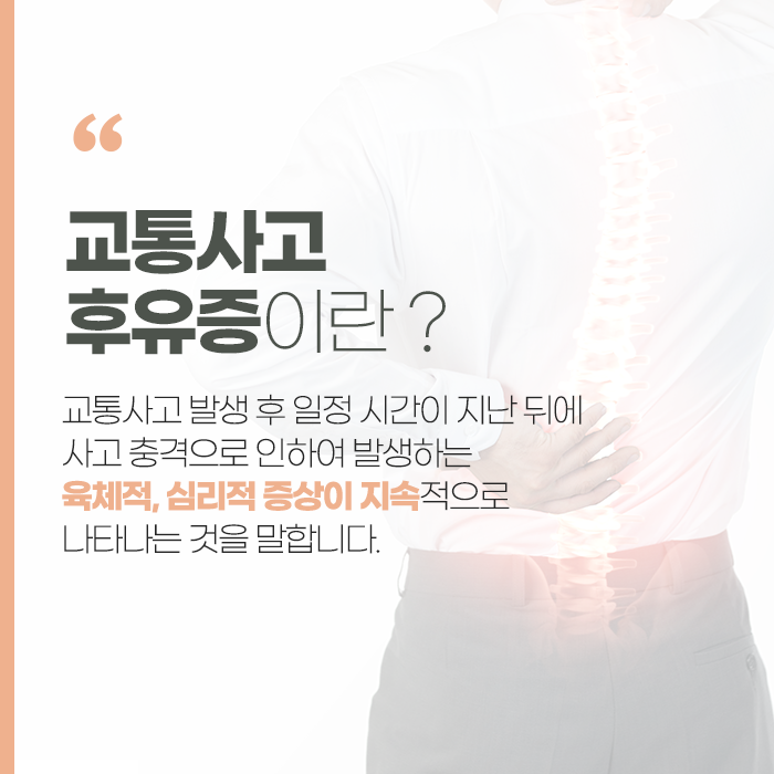 교통사고는 예고 없이 갑작스럽게 일어날 수 있지만, 사고 이후의 대처는 우리가 충분히 준비하고 실천할 수 있는 부분입니다. 사고로 인한 신체 손상을 단순히 겉으로 보이는 상처만으로 판단해서는 안 되며, 통증의 강도와 위치, 경과를 면밀히 관찰하고, 전문가의 조언을 바탕으로 꾸준한 치료를 받는 것이 중요합니다.