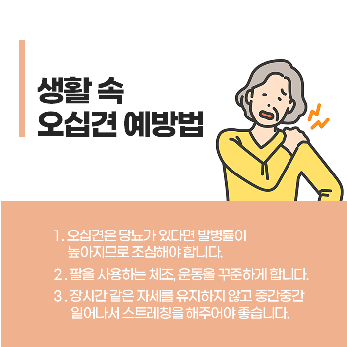 예방을 위해서는 어깨 관절을 가능한 한 자주 움직여주는 것이 좋습니다. 장시간 한 자세로 있거나 어깨 사용을 제한하는 행동은 피하고, 규칙적인 스트레칭과 가벼운 어깨 운동을 통해 관절이 굳지 않도록 관리하는 것이 필요합니다. 특히 당뇨병 환자는 정기적인 어깨 운동으로 유착 발생을 예방하는 것이 좋습니다.