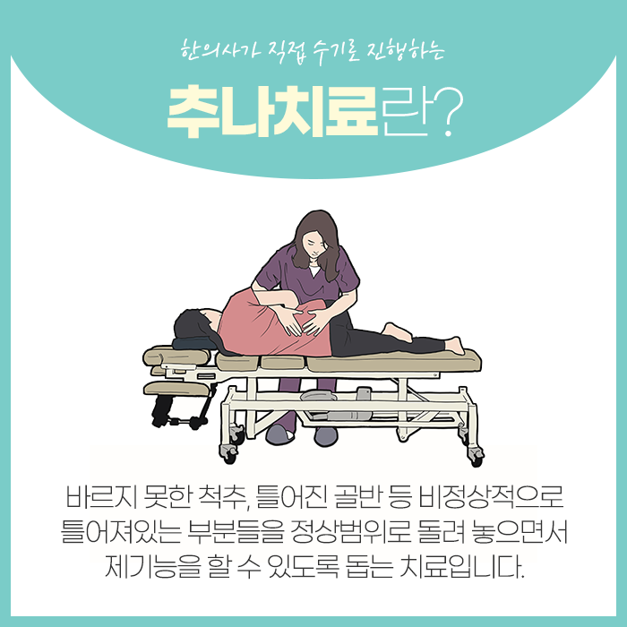 추나치료는 손이나 간단한 도구를 이용해 척추와 관절, 근육의 위치를 바로잡아 신체 정렬을 개선하는 치료법입니다. 한의학 이론을 기반으로 하며, 구조적 불균형을 교정하고 기혈 순환을 원활하게 하여 통증 완화와 기능 회복에 도움을 줍니다.