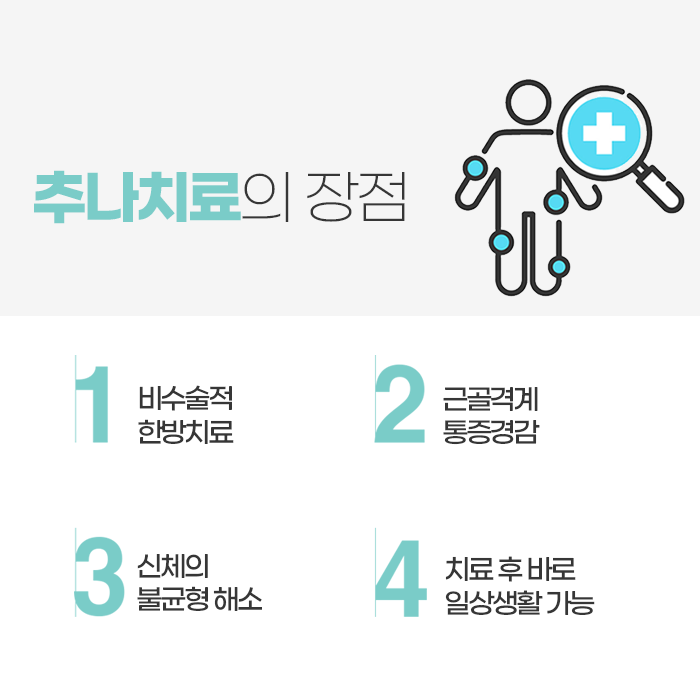 비교적 안전하게 진행되는 치료이지만 주의해야 하는 부분이 있습니다. 추나치료는 비교적 안전한 비수술 치료로 분류되지만, 일부 주의사항을 반드시 염두에 두어야 효과적인 치료가 가능합니다. 추나치료는 숙련된 기술이 요구되는 만큼 자격을 갖춘 한의사에게 시술을 받아야 하며, 숙련된 술기와 풍부한 임상경험을 기반되어 있는 의료진을 통해서 받는 것이 바람직합니다.