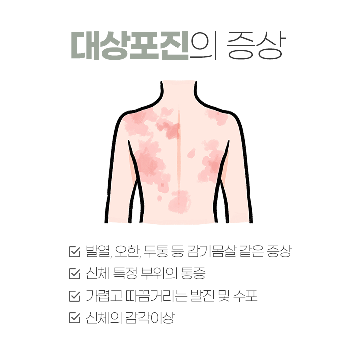 초기에는 뚜렷한 피부 증상 없이 감각 이상, 찌릿한 통증, 저린 느낌, 가려움증 등 신경 자극 증상이 먼저 나타납니다. 이후 2~3일 안에 붉은 반점이 생기고, 그 위로 투명한 수포가 군집을 이루며 나타납니다. 보통 한쪽 신체 부위에 국한되어 발생하며, 가슴, 옆구리, 등, 얼굴, 두피 등 다양한 부위에 생길 수 있습니다. 만약 안면 신경을 따라 발병하면 청력, 시력 저하나 안면 마비 등의 더욱 위험한 2차적인 합병증까지 동반될 수 있으므로 빠른 조치가 중요합니다.