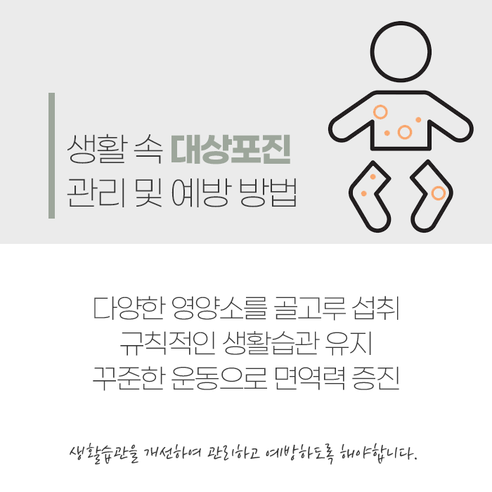 물집이 생긴 피부는 약 1~2주 후 딱지가 생기며 점차 회복됩니다. 이 과정에서 2차 감염을 예방하려면 청결 유지가 중요하고, 손으로 긁거나 물집을 터뜨리지 않도록 주의해야 합니다. 물집 부위는 드레싱으로 보호해주고, 속옷이나 침구류는 자주 세탁하는 것이 좋습니다. 감염성은 낮지만 전염 가능성이 있으므로 수건이나 개인 용품은 따로 사용하도록 합니다.
