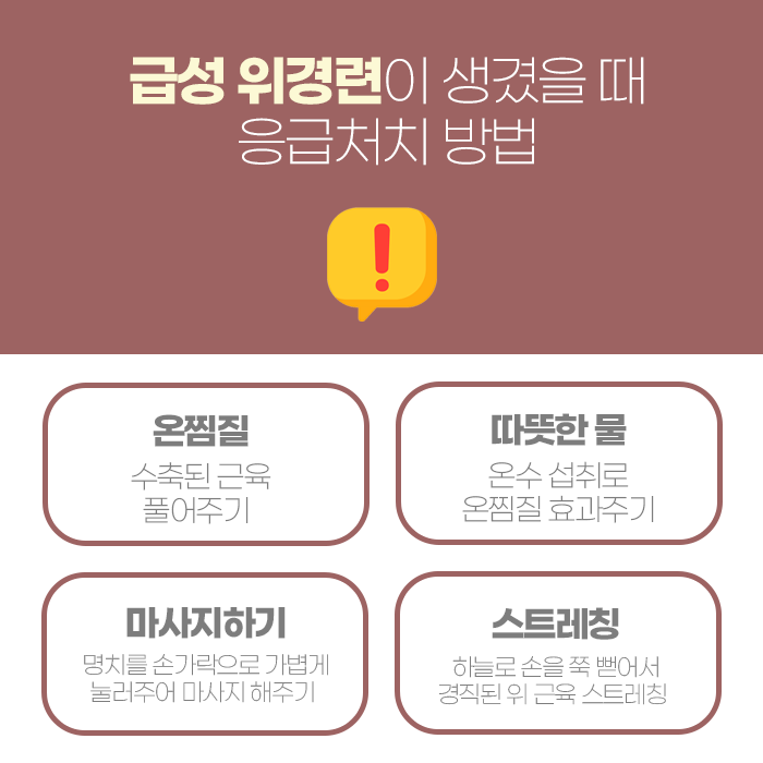 위경련이 발생했을 때 가장 먼저 해야 할 일은 편안한 자세를 취하고, 따뜻한 찜질로 위장 근육의 긴장을 완화하는 것입니다. 찬 음식이나 음료는 위장 점막에 자극을 줄 수 있으므로 피하는 것이 좋습니다. 식사는 규칙적으로 하는 것이 좋고, 한 번에 적은 양을 여러 번 나누어 먹으며, 기름진 음식이나 자극적인 음식 섭취를 줄이는 것이 도움이 됩니다. 위경련을 비롯한 위장관련된 질환이나 증상들은 무엇보다 스트레스 관리가 매우 중요합니다. 명상, 요가, 규칙적인 운동 등으로 자율신경계를 안정시키면 위장 근육 경련 완화에 큰 효과가 있습니다.