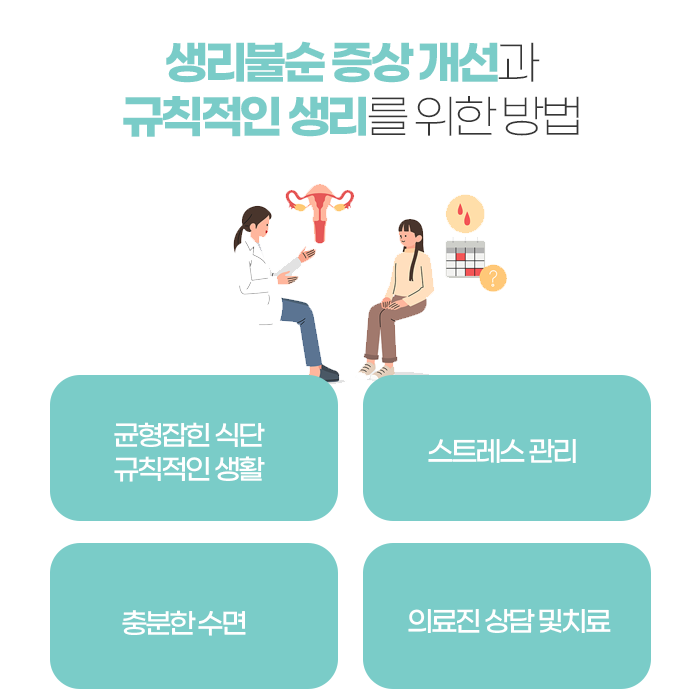 생리불순의 근본적인 원인으로는 자궁 내 혈액 순환 장애, 과도한 스트레스, 혈액 성분 부족, 선천적 생식 기능 저하 등이 있습니다. 이를 방치할 경우 무월경이나 불임과 같은 심각한 문제로 발전할 수 있으므로, 생리 주기가 3주 이상 불규칙하다면 반드시 정확한 진단을 받아야 합니다. 구조적 이상이 없을 경우 대개 2~3개월 내에 약물치료와 침구 치료 등으로 증상을 개선할 수 있습니다.