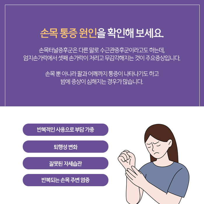 오랜 시간 타이핑이나 스마트폰 사용을 할 경우 중간중간 손과 손목의 긴장을 풀어줘야 하며, 보호대를 착용하는 것도 좋은 방법입니다. 단 불편함이나 통증이 반복된다면 초기에 검사받고 한방치료의 도움받는 것을 추천드립니다.