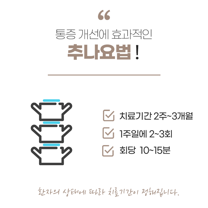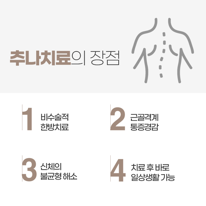추나요법은 반복적이고 일상적인 잘못된 자세에서 비롯된 문제를 근본적으로 해결해 주는 데 효과적인 치료로, 특히 체형 교정에 관심이 많은 현대인에게 더욱 적합합니다. 장시간 같은 자세를 유지하는 학생이나 직장인, 육아나 가사노동으로 특정 부위에 부담이 큰 주부, 노화로 인해 척추가 약해지는 중장년층 모두에게 폭넓게 적용 가능합니다.