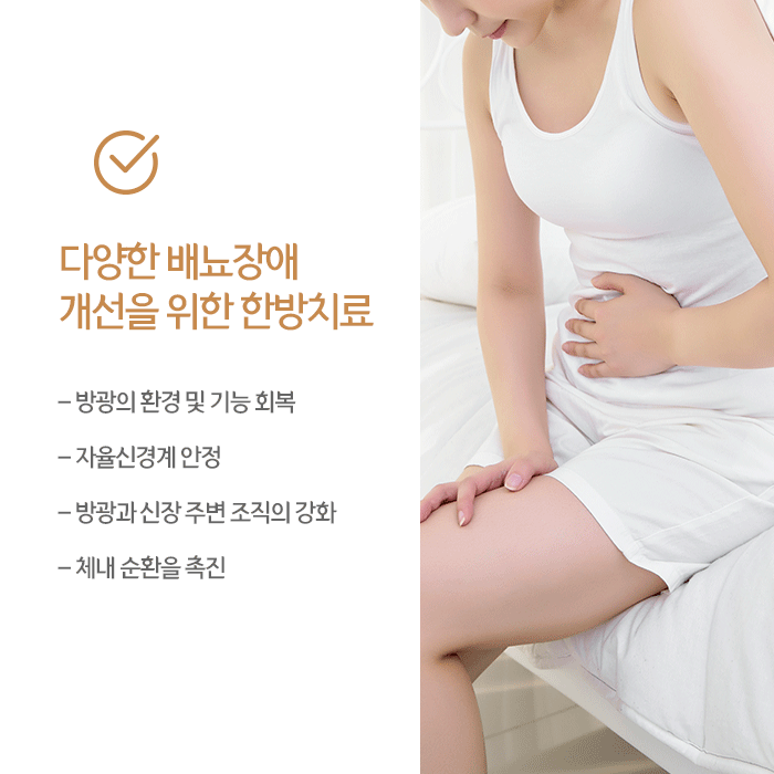 증상에 따라 치료 방법이 달라지는 만큼 배뇨장애가 발생한다면 검사를 통해 확인해보는 것이 바람직합니다. 한약, 약침, 부항, 뜸, 추나요법 등 복합적인 한방치료를 통해 여러 배뇨장애 개선을 기대할 수 있습니다. 체질에 맞는 약재를 활용해 조제하는 한약은 아랫배 주변 어혈을 제거하고 혈류순환을 촉진해 따뜻하게하면서 기능과 환경개선을 돕습니다.
