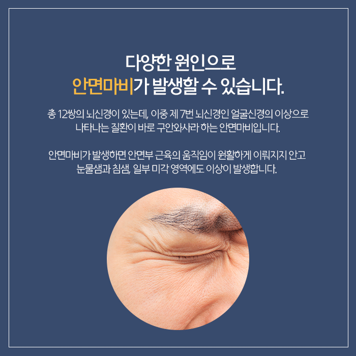 얼굴신경은 안면부 근육운동 및 미각과 눈물샘, 침샘 등의 영역을 관장하고 있어, 구안와사 발병 시 안면마비 증상을 비롯해 구강건조, 안구건조, 미각소실 등의 증상이 함께 나타날 수 있습니다.